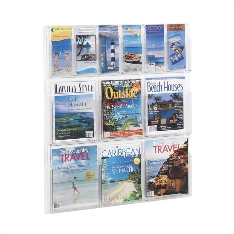 Safco - Magazine Racks - 5606CL - Think outside the box by looking in! Reveal design displays literature clearly. Each pocket holds 1-3/4 of printed material. Thermoformed one-piece units have no sharp edges or corners. The displays are wall mountable with hardware included. Wire partition hangers fit all Reveal Displays. Optional Floor Stand (5619BL) Compartment Capacity: 1 3/4 printed material Compartment Quantity: 6 Magazine, 6 Pamphlet Compartment Size: 9 1/4w x 1 3/4d x 11 1/4h (magazine), 4 1/4w x 1 3/4d x 9 3/8h (pamphlet) Material Thickness: 2.25mm (PETG) Mounting Hardware: Included Material(s): PETG-Plastic GREENGUARD: Yes* Assembly Required: No Color: Clear Finished Product Dimensions: 30w x 2d x 34 3/4h Finished Product Weight: 11 lbs. * As an industry leader, Safco aims to set high environmental standards offering a large collection of GREENGUARD Indoor Air Quality Certified products and GREENGUARD Children and Schools Certified products. The GREENGUARD Certification Program is internationally recognized for evaluating product emissions and certifying building materials, furnishings, finishes, and cleaning products and processes that meet stringent indoor air quality criteria defined by GEI.